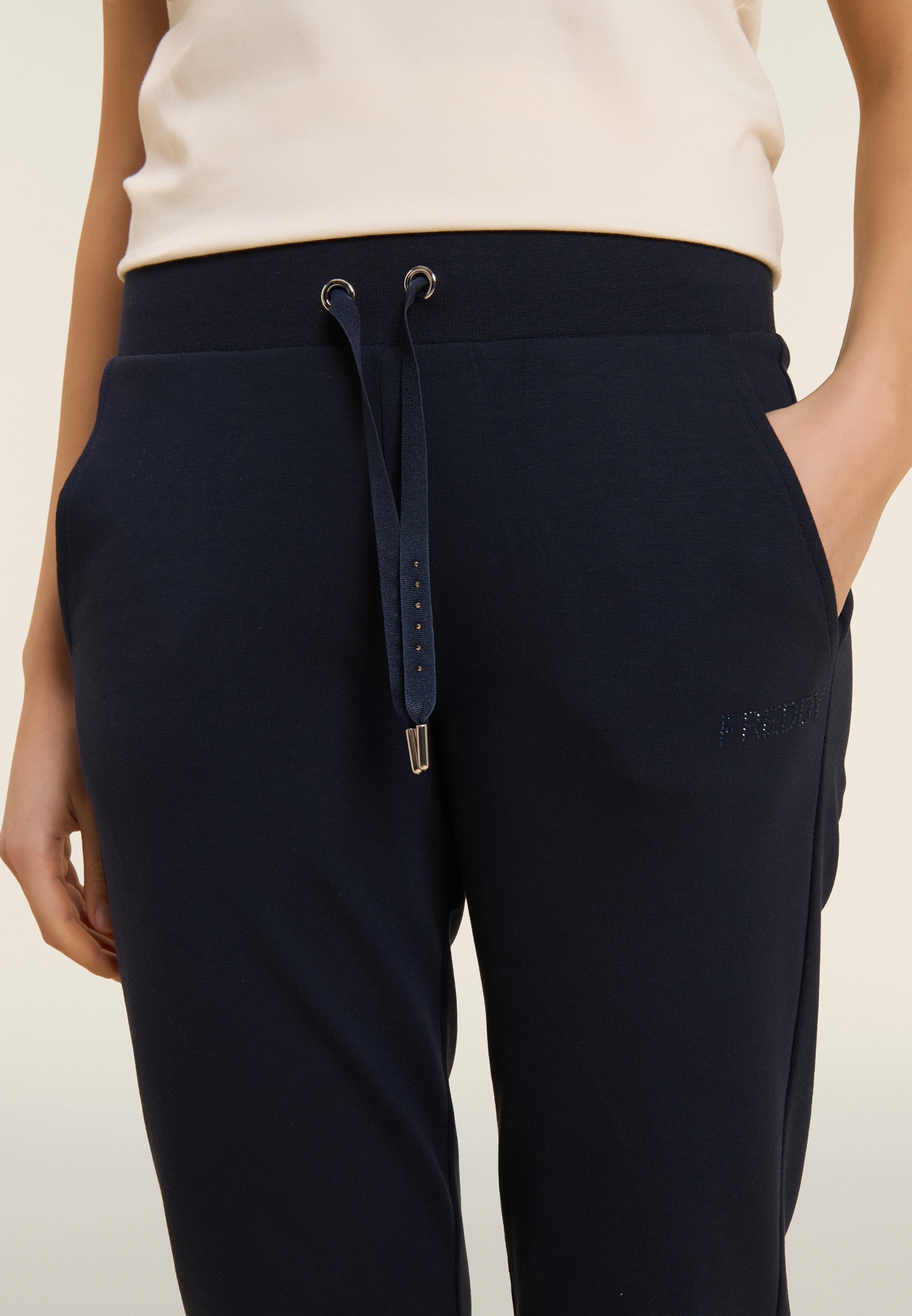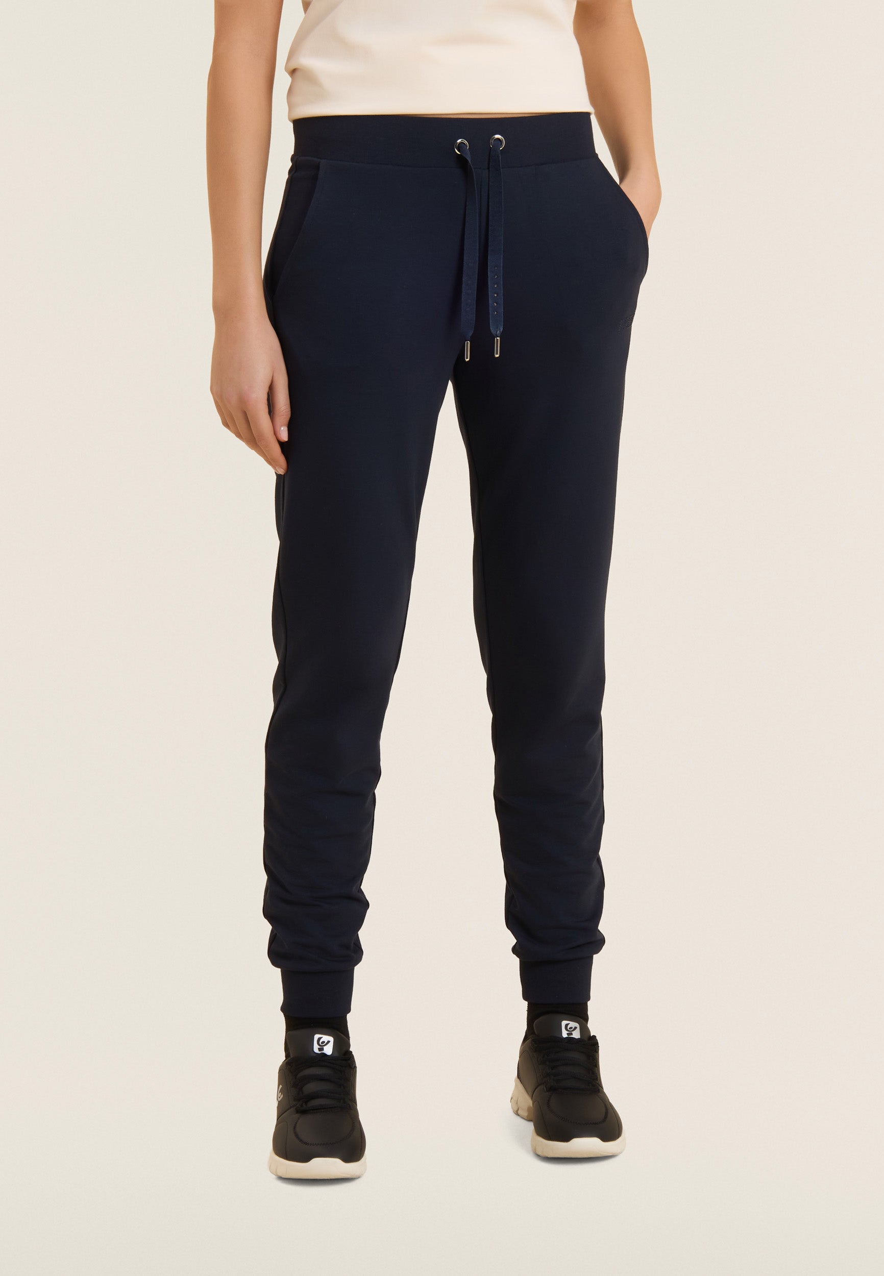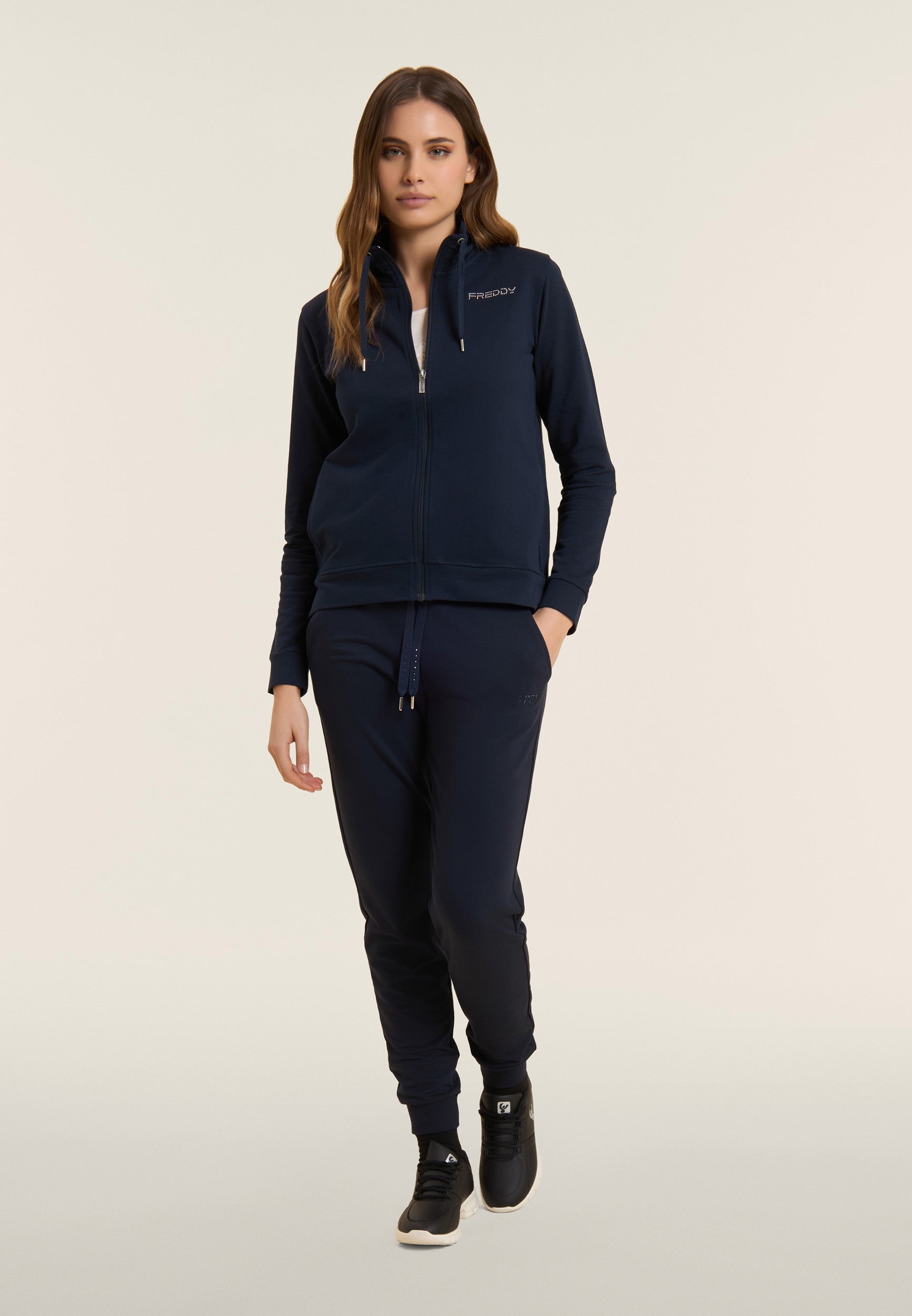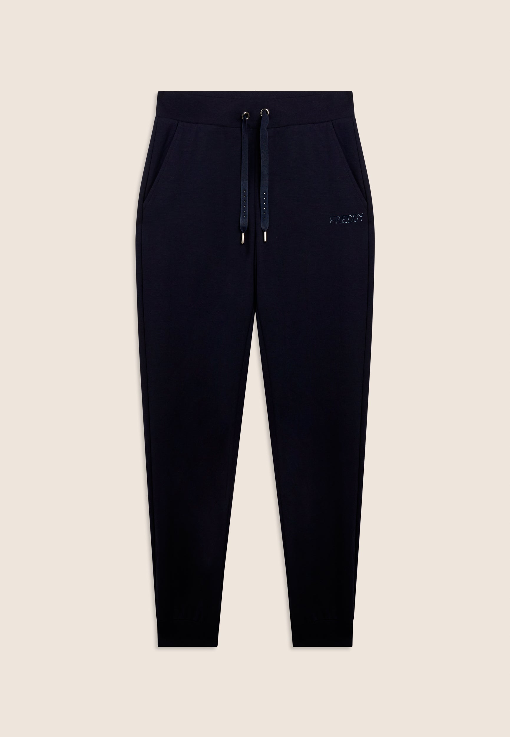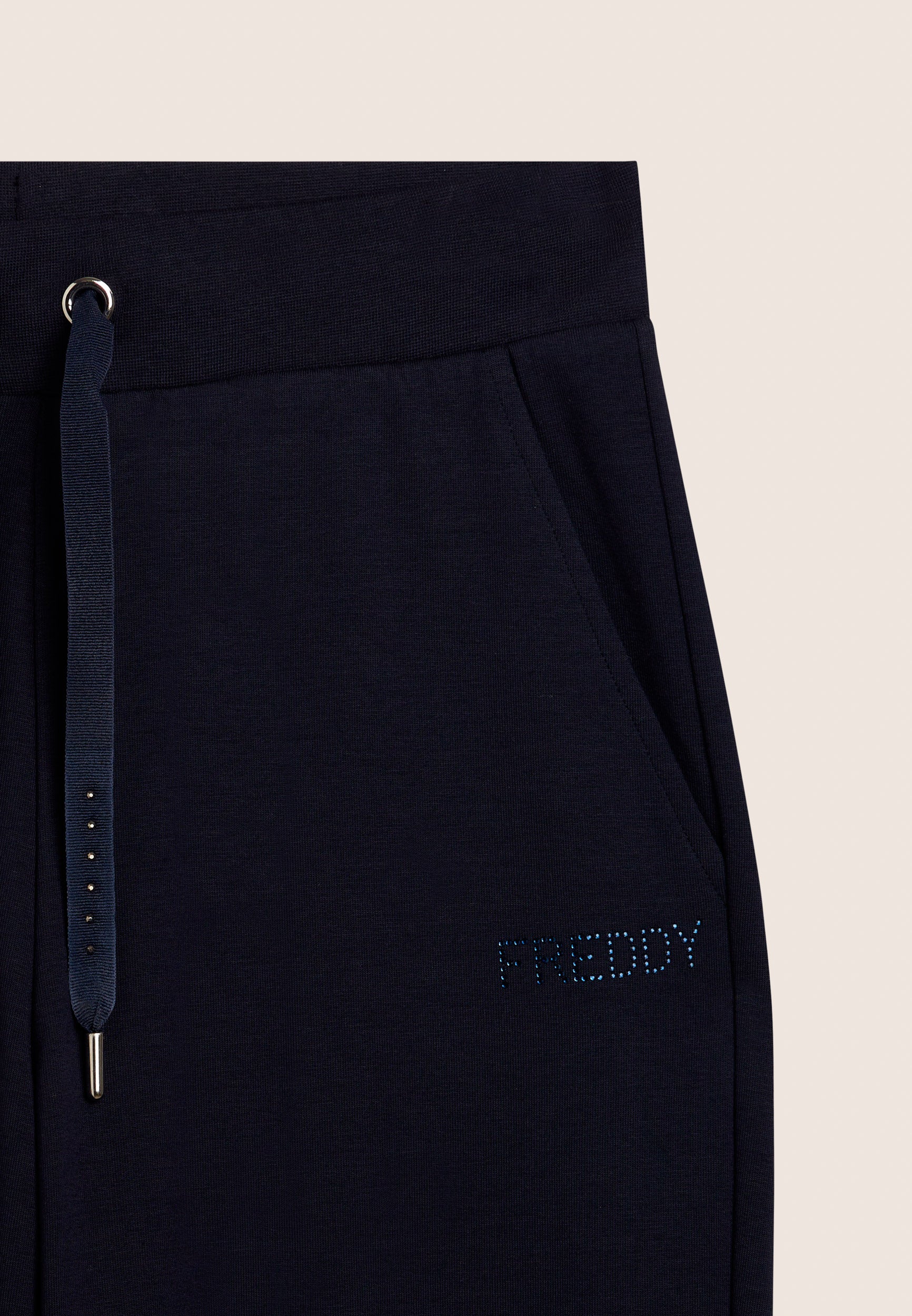 Athletic trousers with a regular fit and regular length, featuring a regular waist with a ribbed band and drawstring. The ribbed cuffed leg creates a dynamic and sporty effect. The FREDDY logo in colour-tone rhinestones, located on the left side, adds brightness to the garment. Slant pockets complete the practical design. The French terry fabric, consisting of modal, cotton and elastane, is soft, stretchy and breathable for optimal comfort and a modern look.