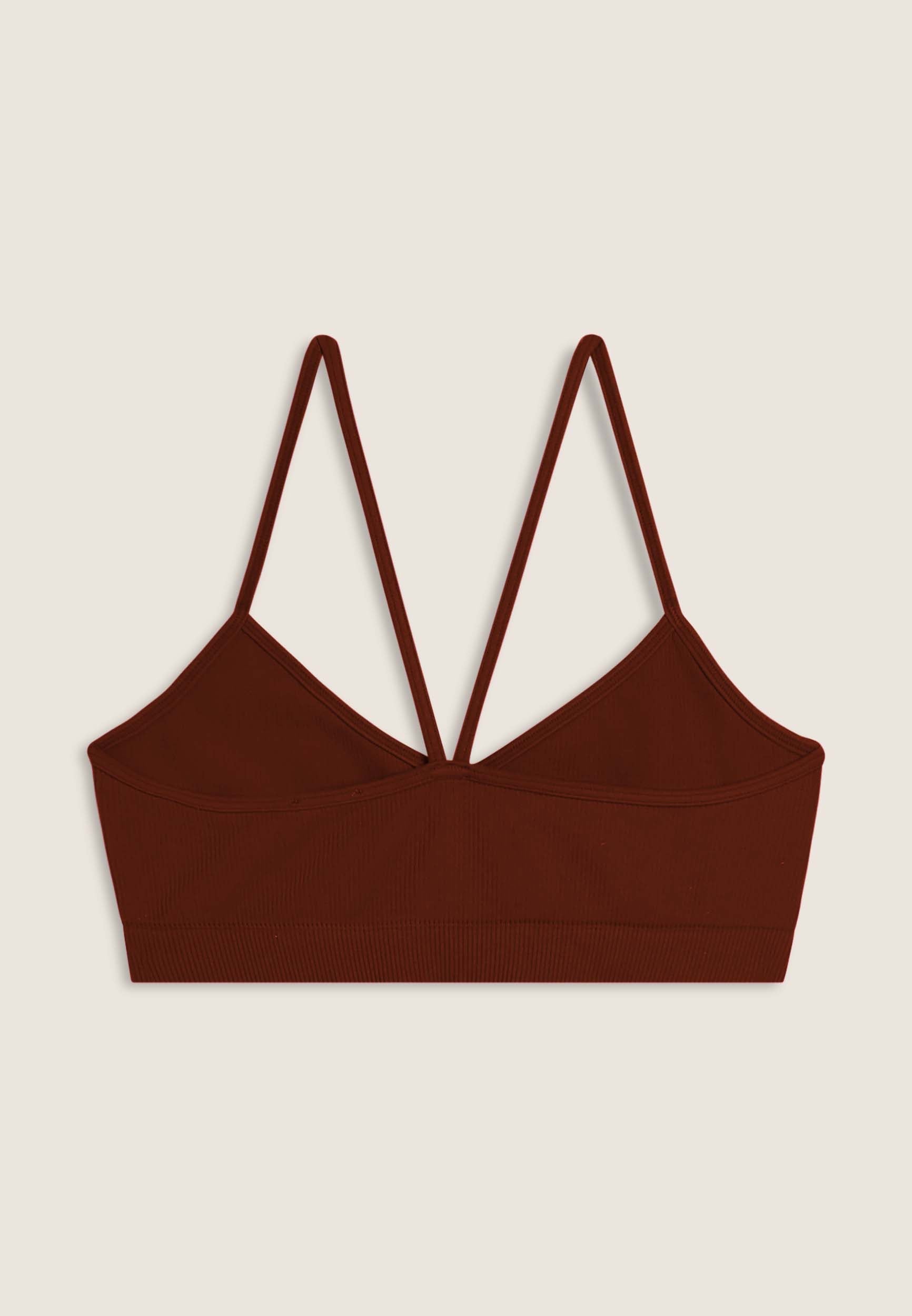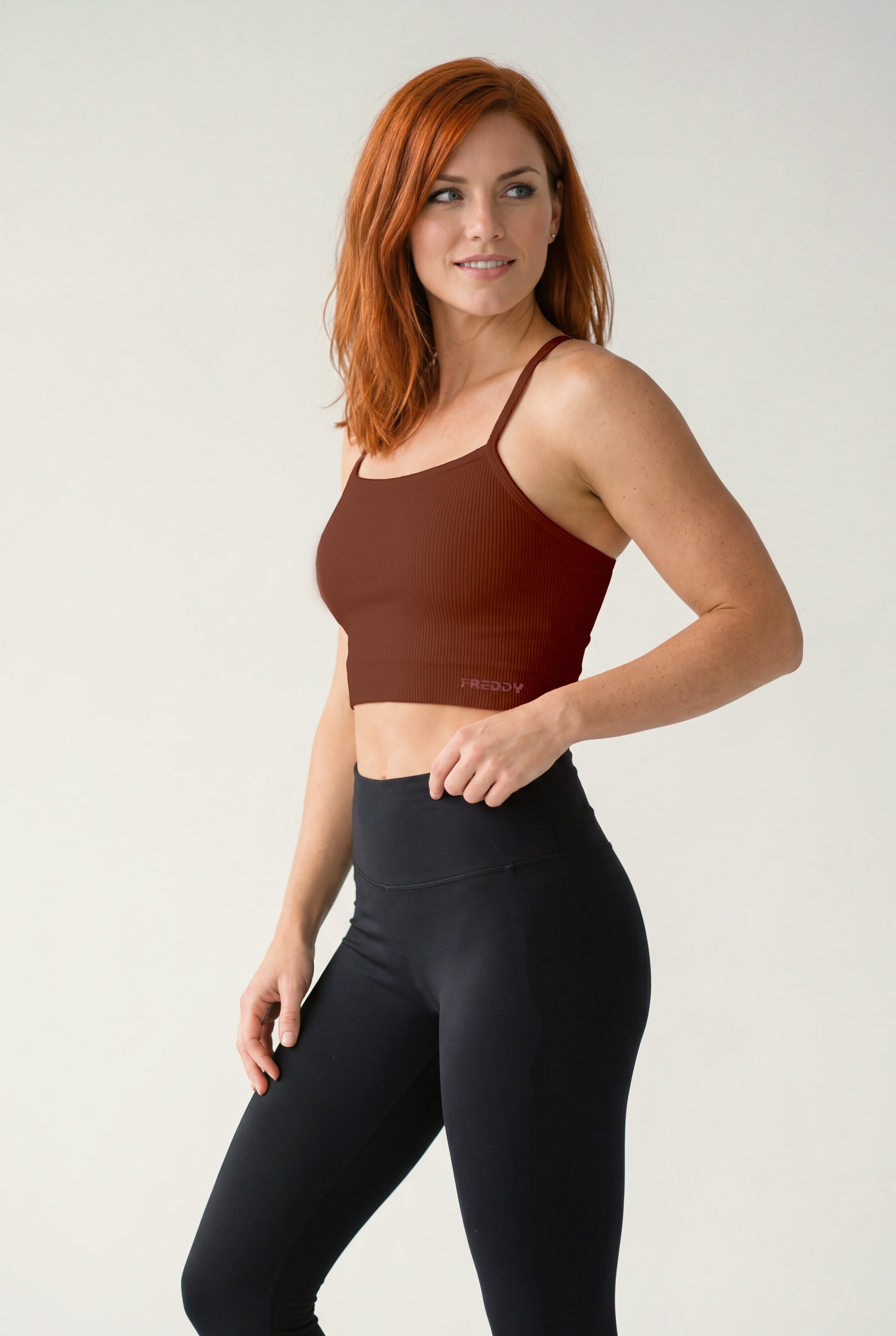 Medium support sports bra, ideal for variable intensity training. Made from seamless ribbed fabric, it seamlessly follows the contours of the body to provide total comfort. The design includes a wide neckline and thin shoulder straps crossed at the back, with a small FREDDY jacquard logo on the underbust band.