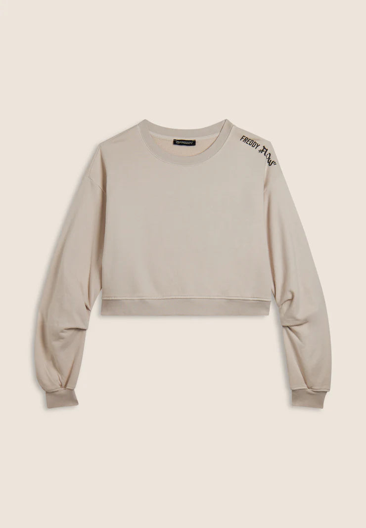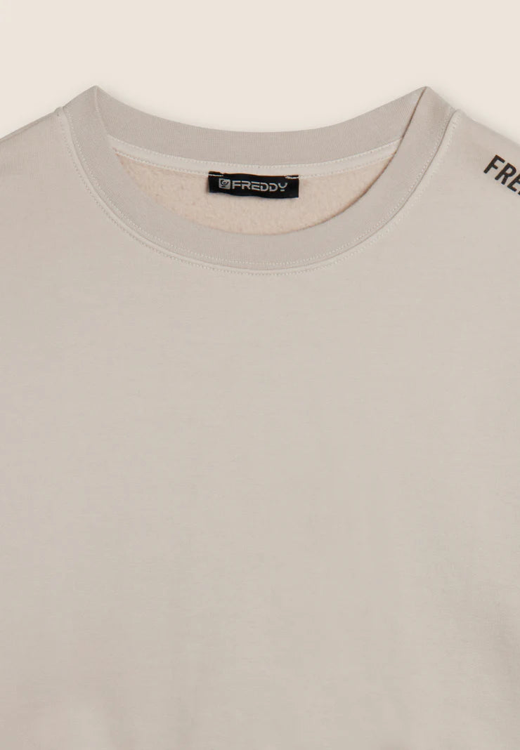 Minimalist but impressive: this oversized cropped sweatshirt is the perfect garment for those who love details. The small “Flow” print and FREDDY logo along the shoulder add personality to the look, while the brushed, enzyme-treated fabric guarantees extreme softness and full colour. Ribbed crew neck and cuffs, dropped shoulder and short cut for a casual and super contemporary vibe.