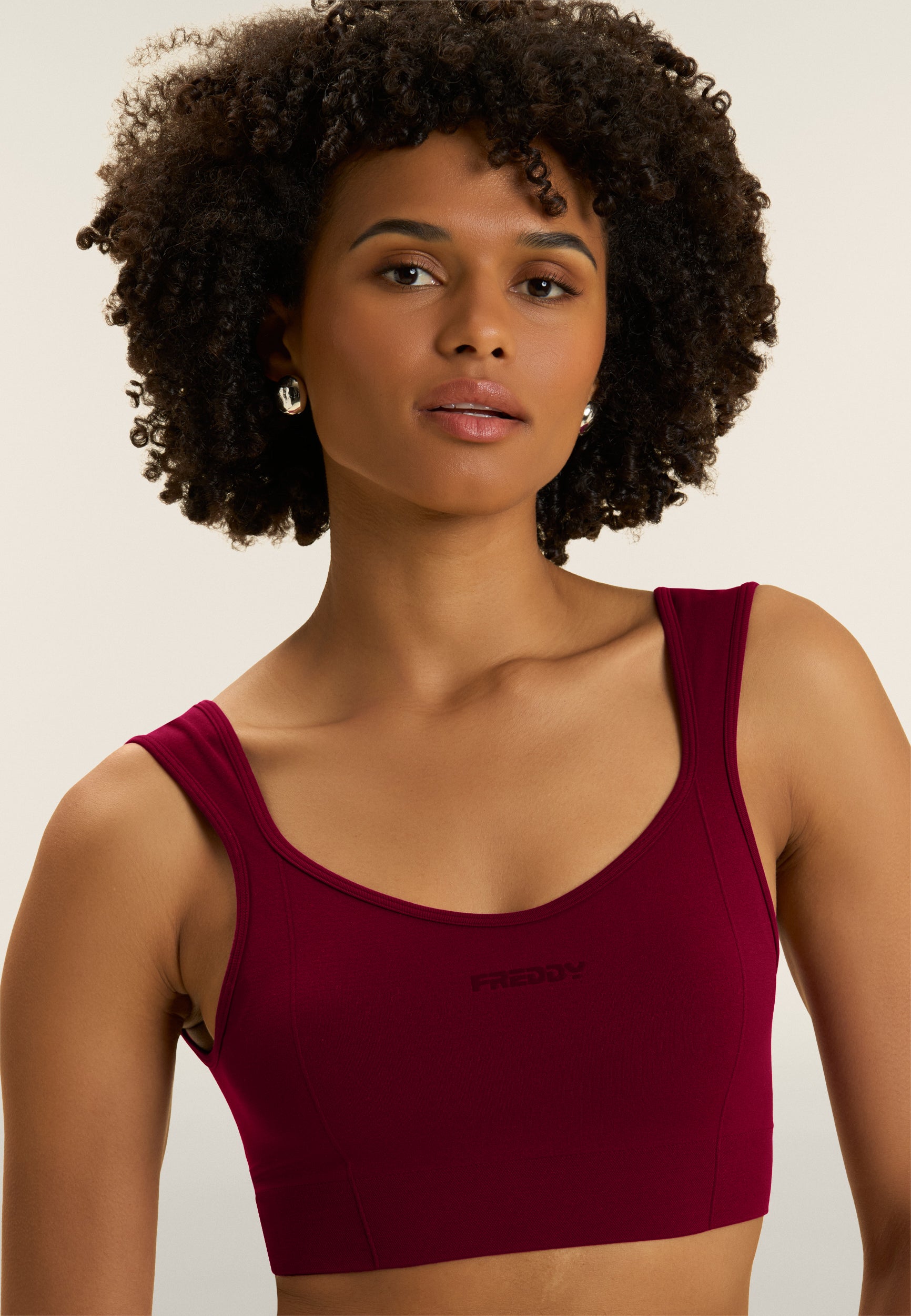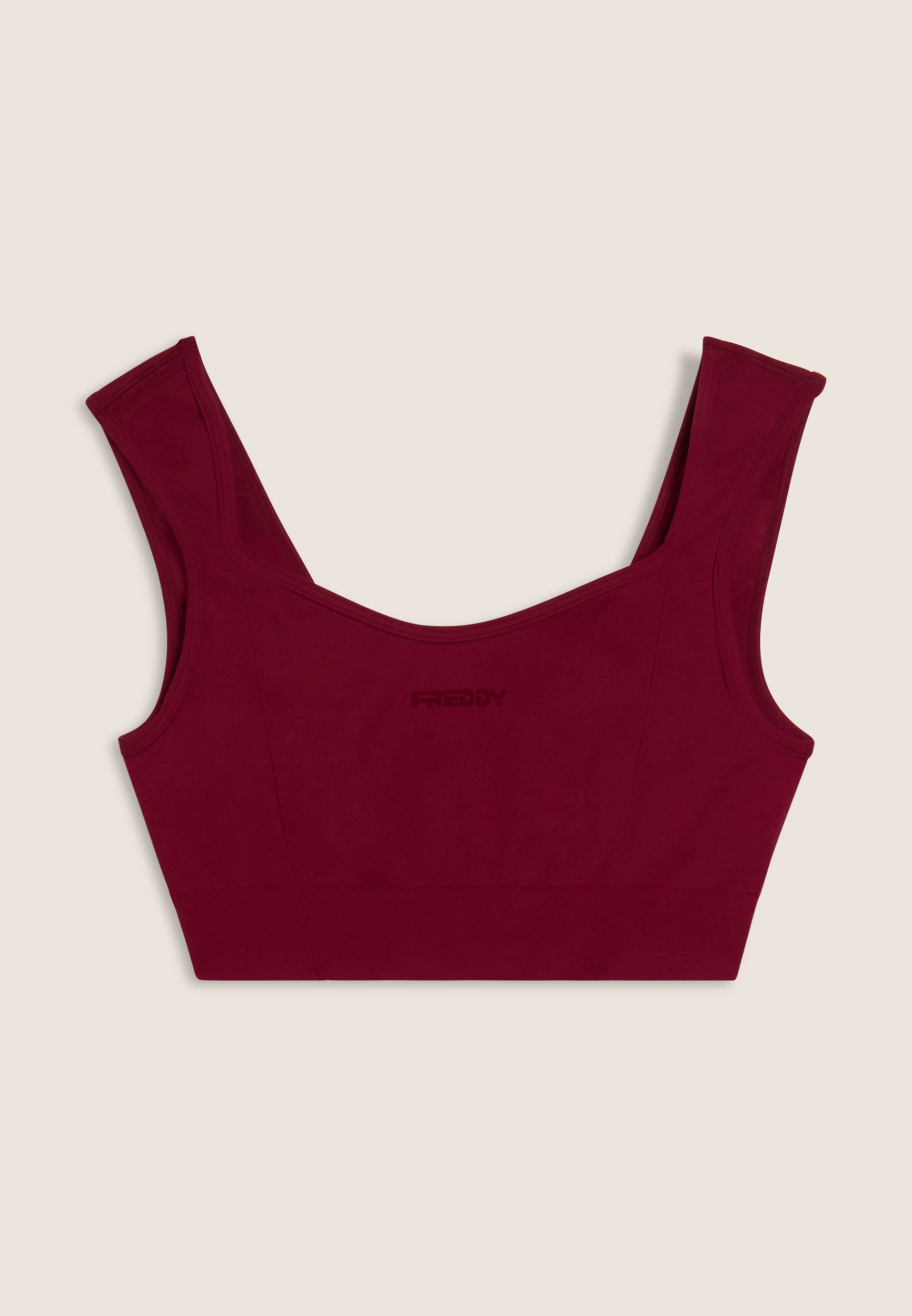 With its feminine and comfortable design, this light support sports top is perfect for yoga and low intensity activities. Sweetheart neckline at the front and square neckline at the back with regular shoulder straps. The nylon jersey performance fabric is soft, breathable and lightweight, with a small FREDDY contrasting logo on the front.