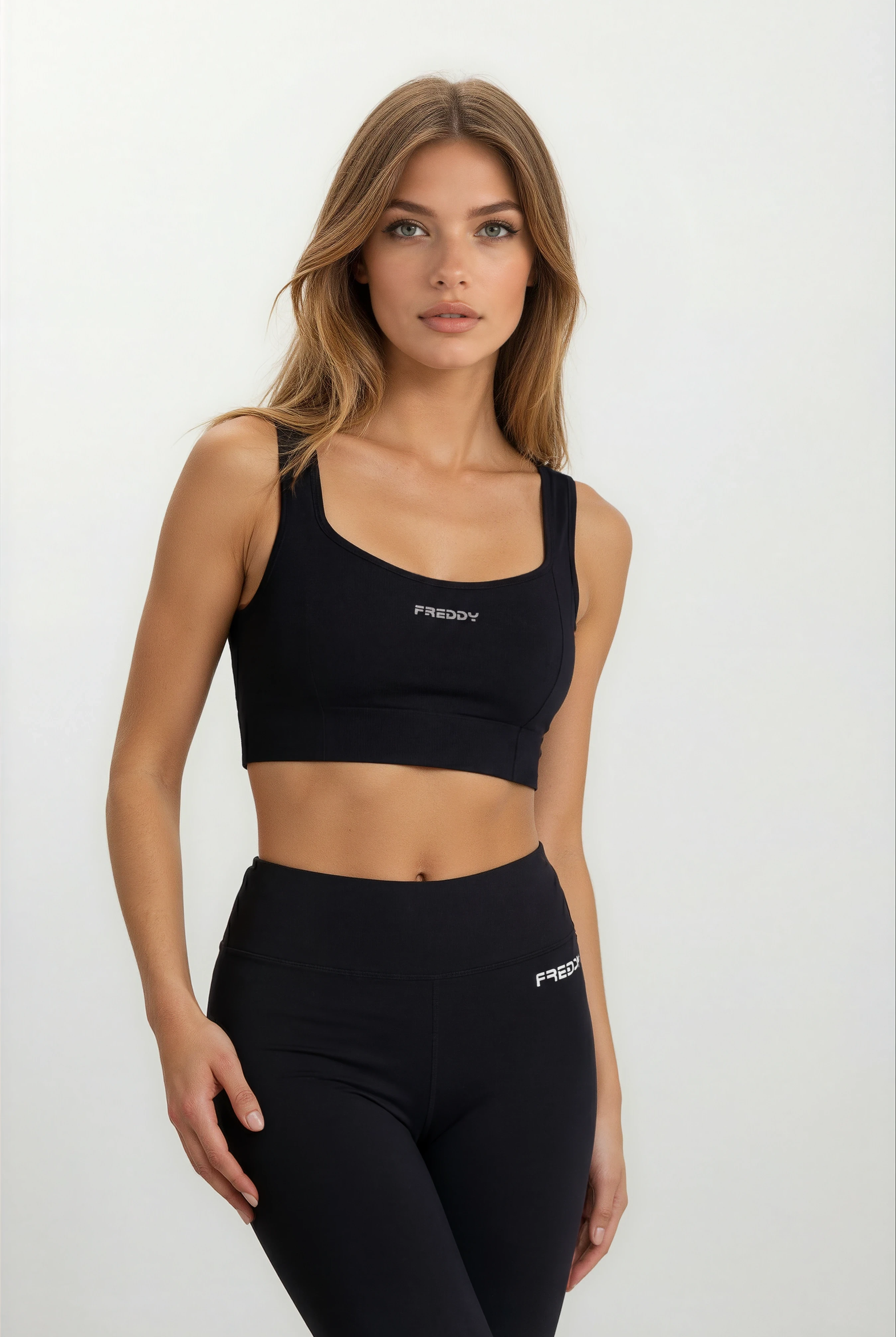 With its feminine and comfortable design, this light support sports top is perfect for yoga and low intensity activities. Sweetheart neckline at the front and square neckline at the back with regular shoulder straps. The nylon jersey performance fabric is soft, breathable and lightweight, with a small FREDDY contrasting logo on the front.