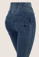 WR.UP® super skinny push-up trousers in heavy organic cotton stretch jersey with slightly worn denim effect wash. Vertical and horizontal seams emphasise the waist, creating a feminine and structured design. High waist with central zip.