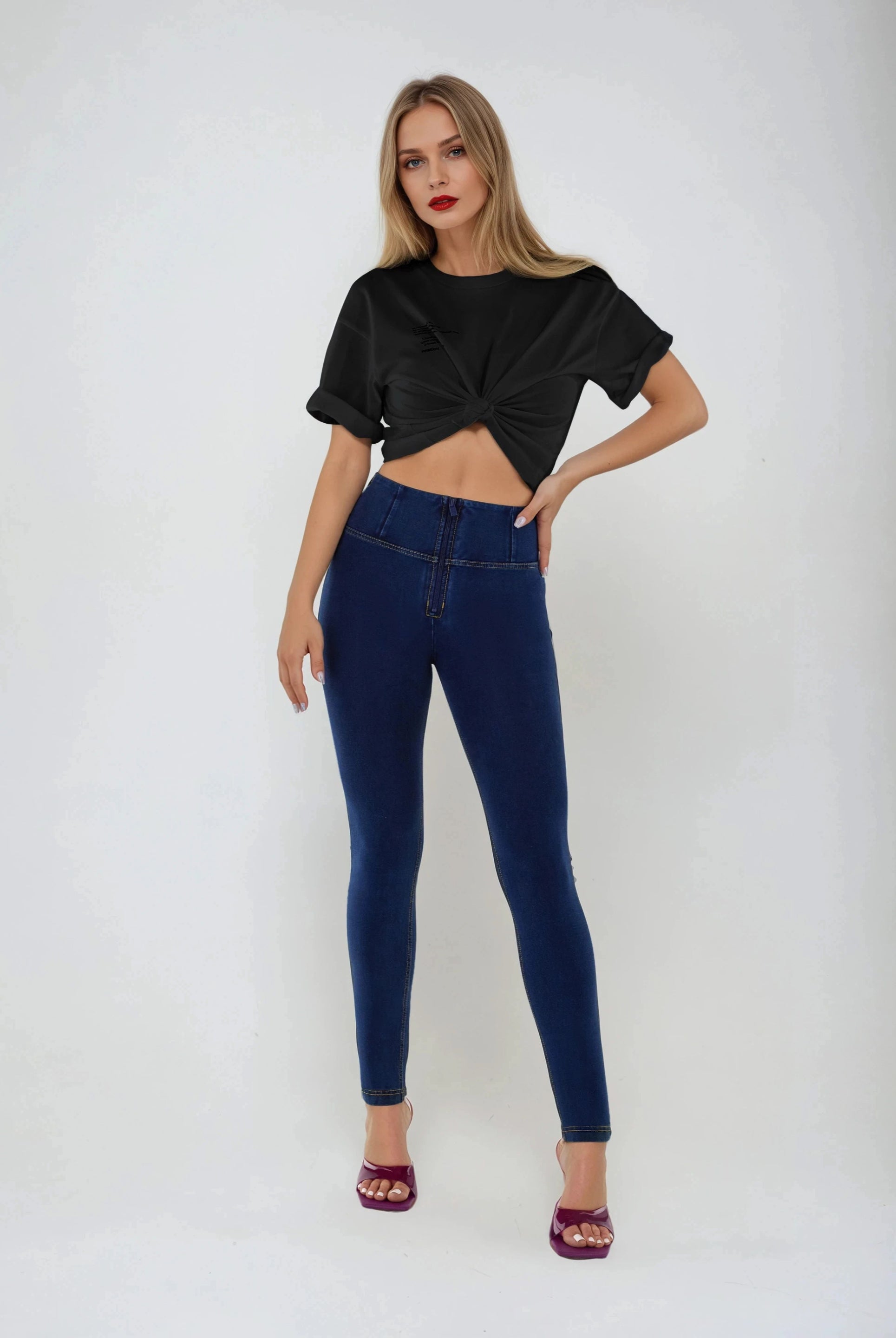 Die Mid-Waist-Modelle sitzen zwischen der Taille und dem Bauchnabel. Alle unsere mittlere Jeans haben vorne drei Freddy-typische Knöpfe. Sie sind etwas höher als unsere Regular-Waist-Hosen, aber nicht ganz so hoch, wie die High-Waist-Modelle. Sie haben einen bequemen, hohen Bund ohne Silikonstreifen, und die Knöpfe sorgen für einen perfekten Sitz. Jeans in Mid Waist eignen sich vor allem für kurvigere Frauen, die mehr Stütze und Form für den Bauch und die Taille möchten. Zusätzlich zaubern die Hosen natürlich den perfekten Po.