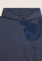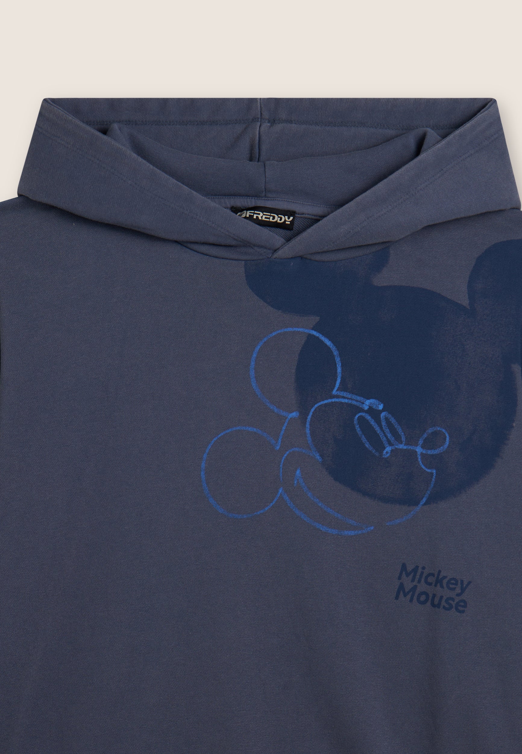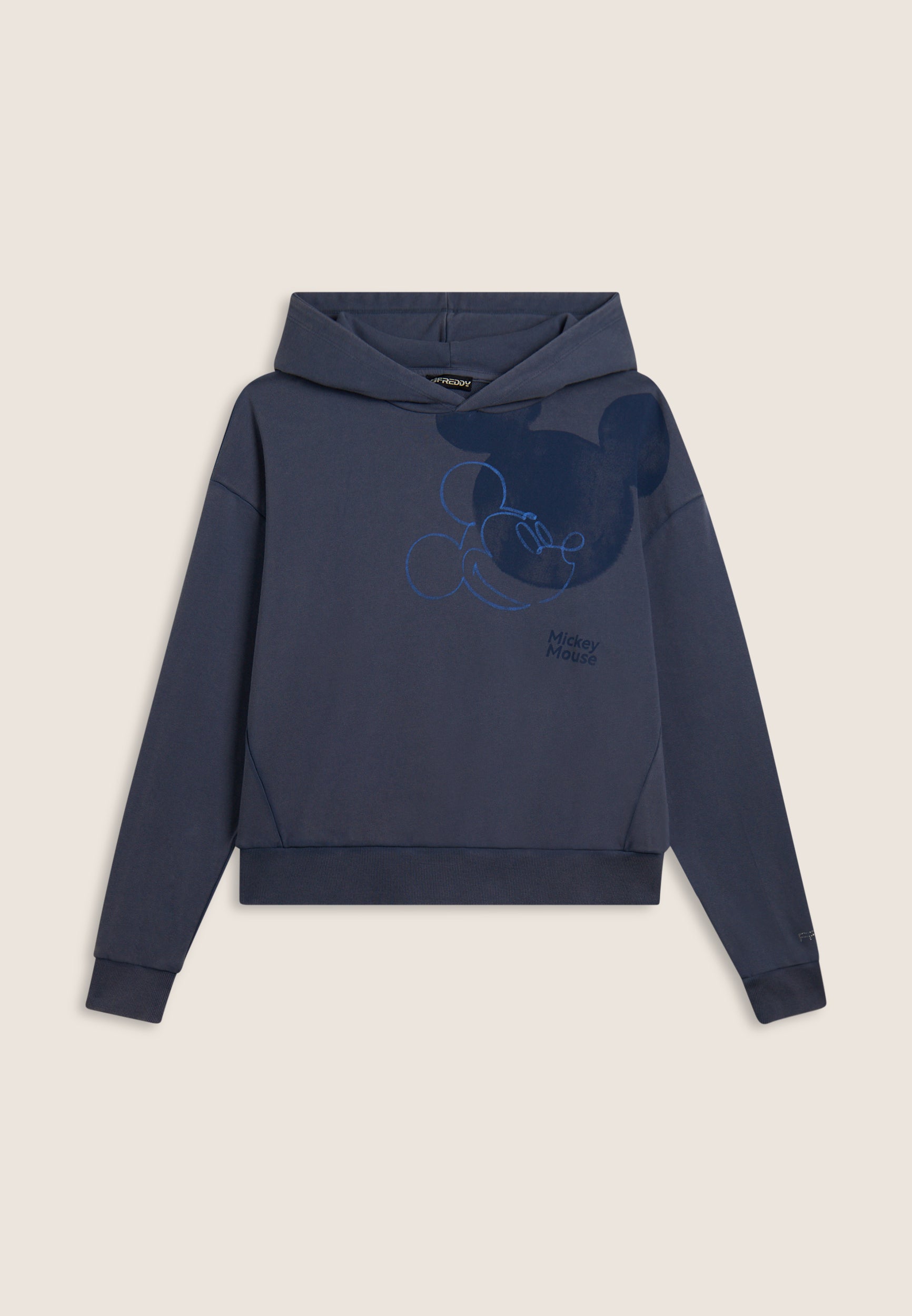 Women's comfort fit French terry sweatshirt. The jersey-lined hood is combined with dropped-shoulder sleeves and ribbed cuffs. The bottom is finished with a ribbed waistband. The large Mickey Mouse print on the front is accompanied by the small Disney logo on the back and the FREDDY logo decorated with rhinestones on the sleeve bottom. The acid wash effect gives the garment a worn look and irregular shades, making it unique.