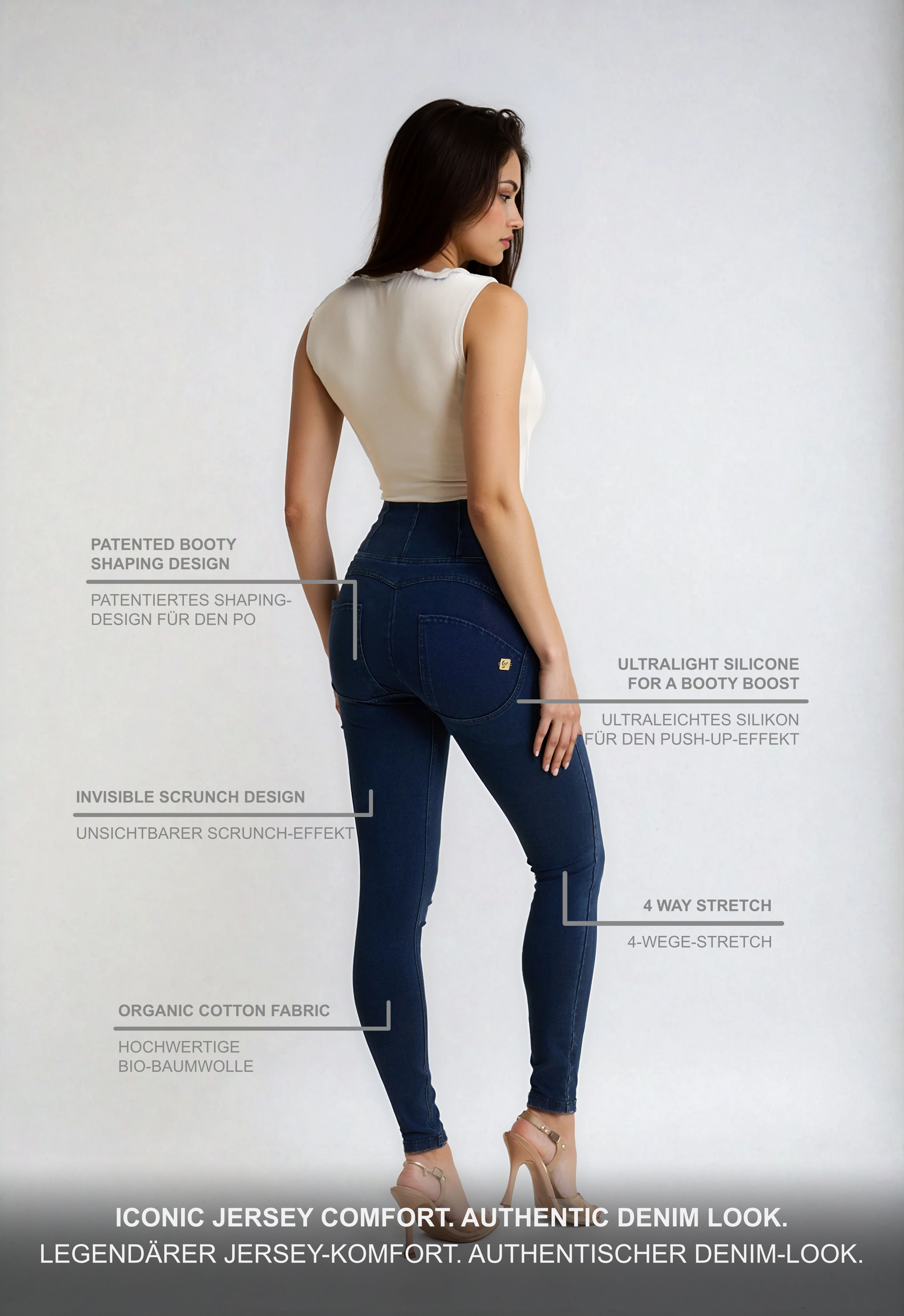 WR.UP® housut sinisenä: suunniteltu imarteleviksi ja liikkuviksi kanssasi. Ne yhdistävät ajattoman täyspitkän mallin, joka sopii kaikille vuodenajoille. Lisäksi niissä on imarteleva korkeavyötärö, joka tarjoaa lempeää tukea. Ilmeen täydentää tyylikäs kapea istuvuus, joka myötäilee muotojasi. Valmistettu yhdistämällä ajaton farkkutyyli parannetulla mukavuudella ja joustavuudella. Osana WR.UP®-mallistoa ne sisältävät patentoitua teknologiaa, joka luonnollisesti korostaa ja muokkaa siluettiasi. Täydelliset lukemattomiin tilaisuuksiin, rentoista tyylikkäisiin.