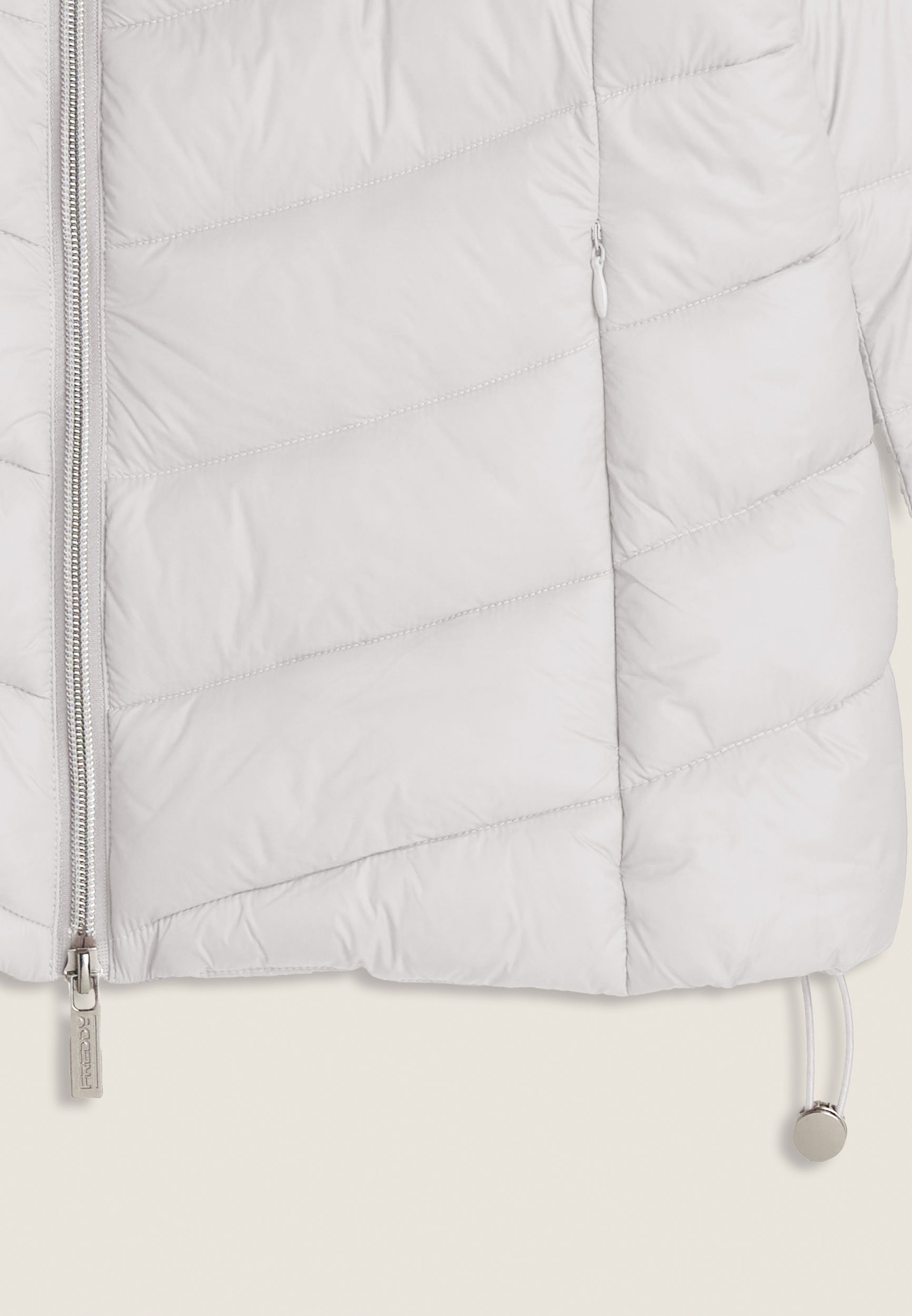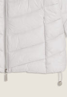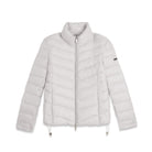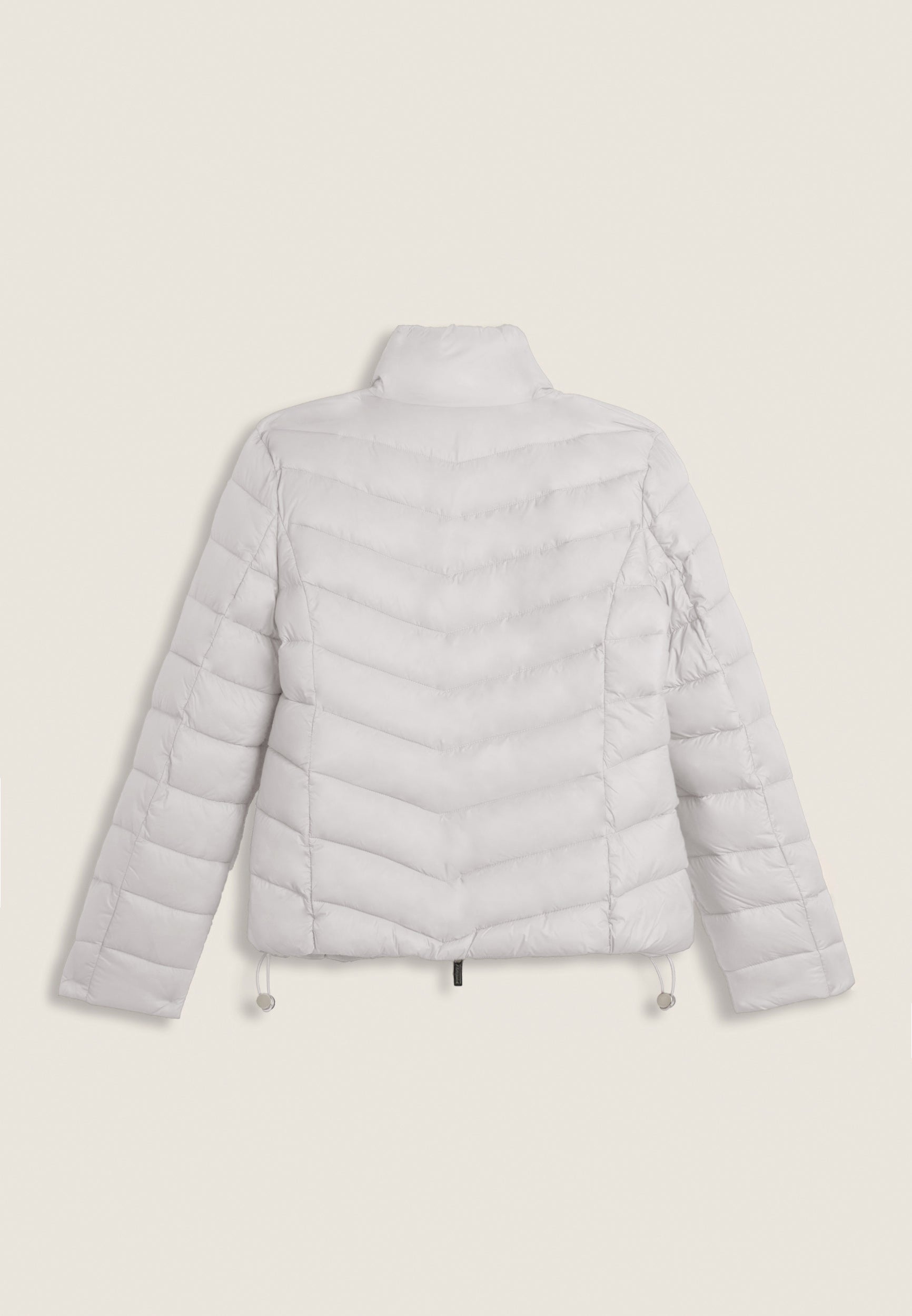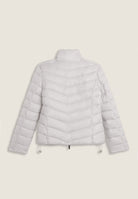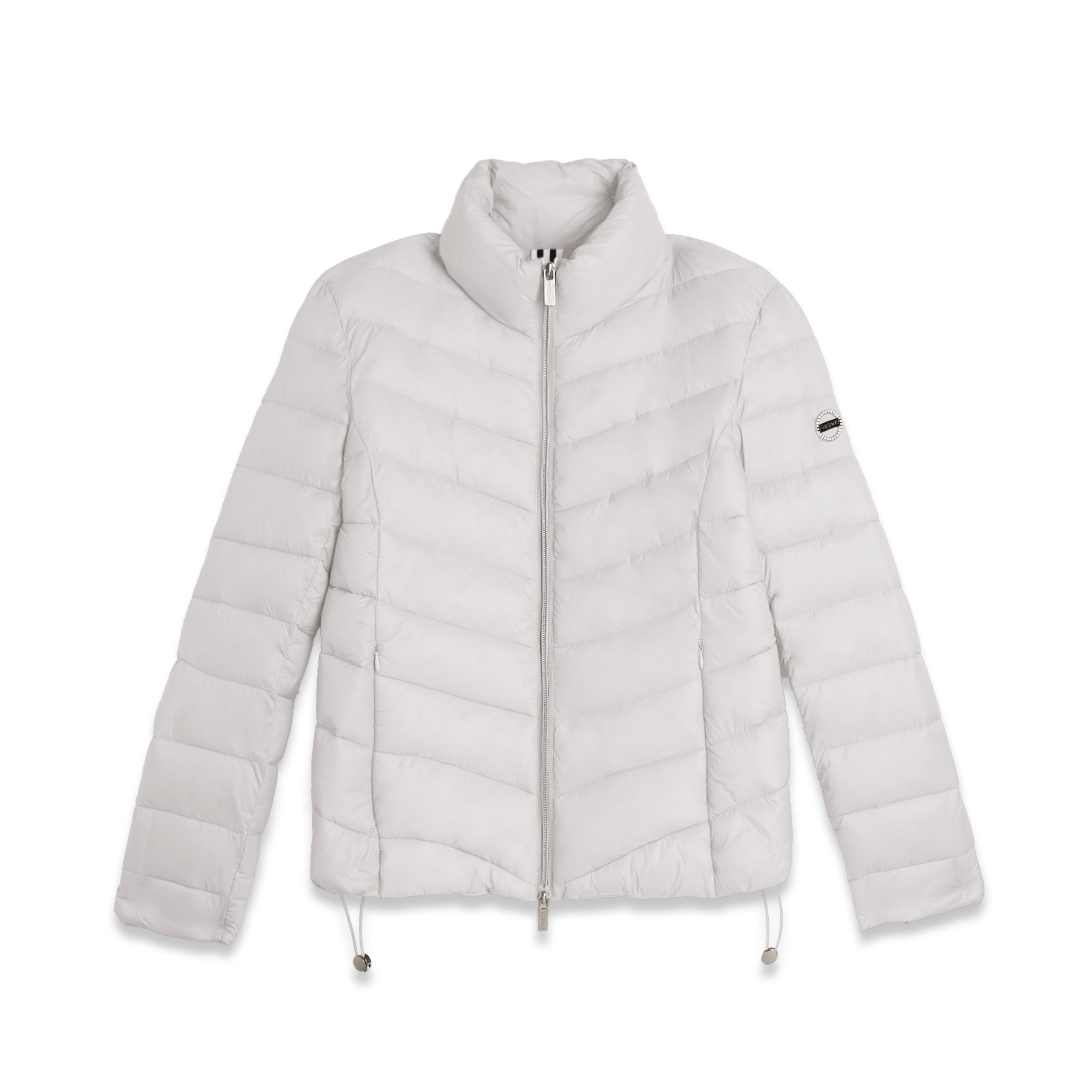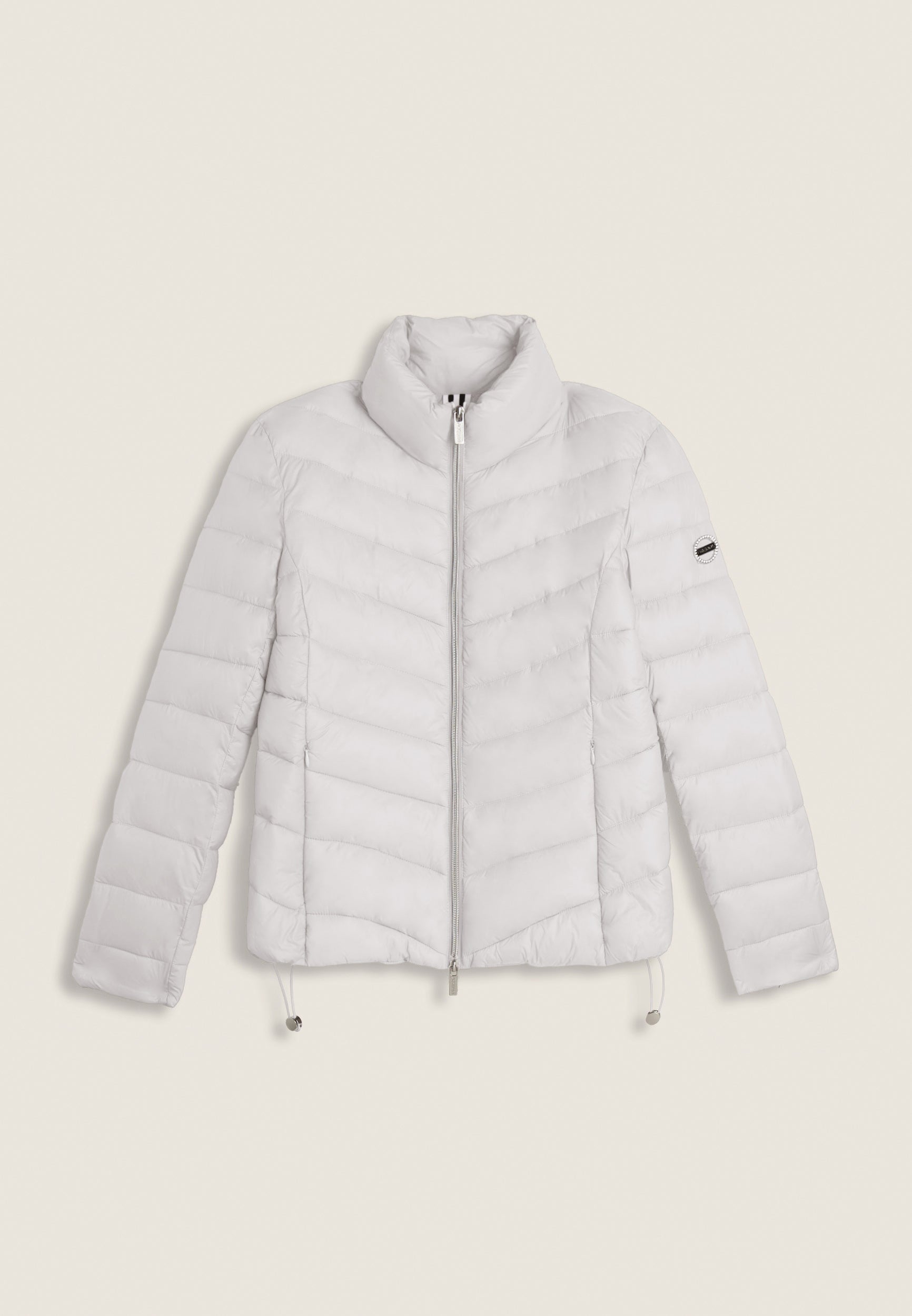 Women's regular fit down jacket with horizontal bands and length just below the waist, perfect for tackling the colder days. The turtleneck and full double-slide zip fastening provide optimal protection from the cold. The adjustable drawstring waist allows for a customised fit. Glossy nylon exterior with water repellent treatment and animal-friendly fake-down quilting, warm and effective even in wet conditions. Feminine details such as the rhinestone logo on the left sleeve and practical front zipped pockets complete the look.