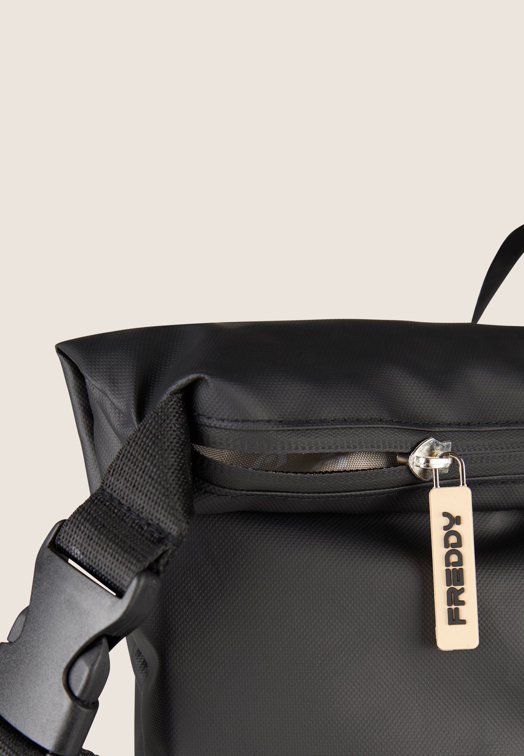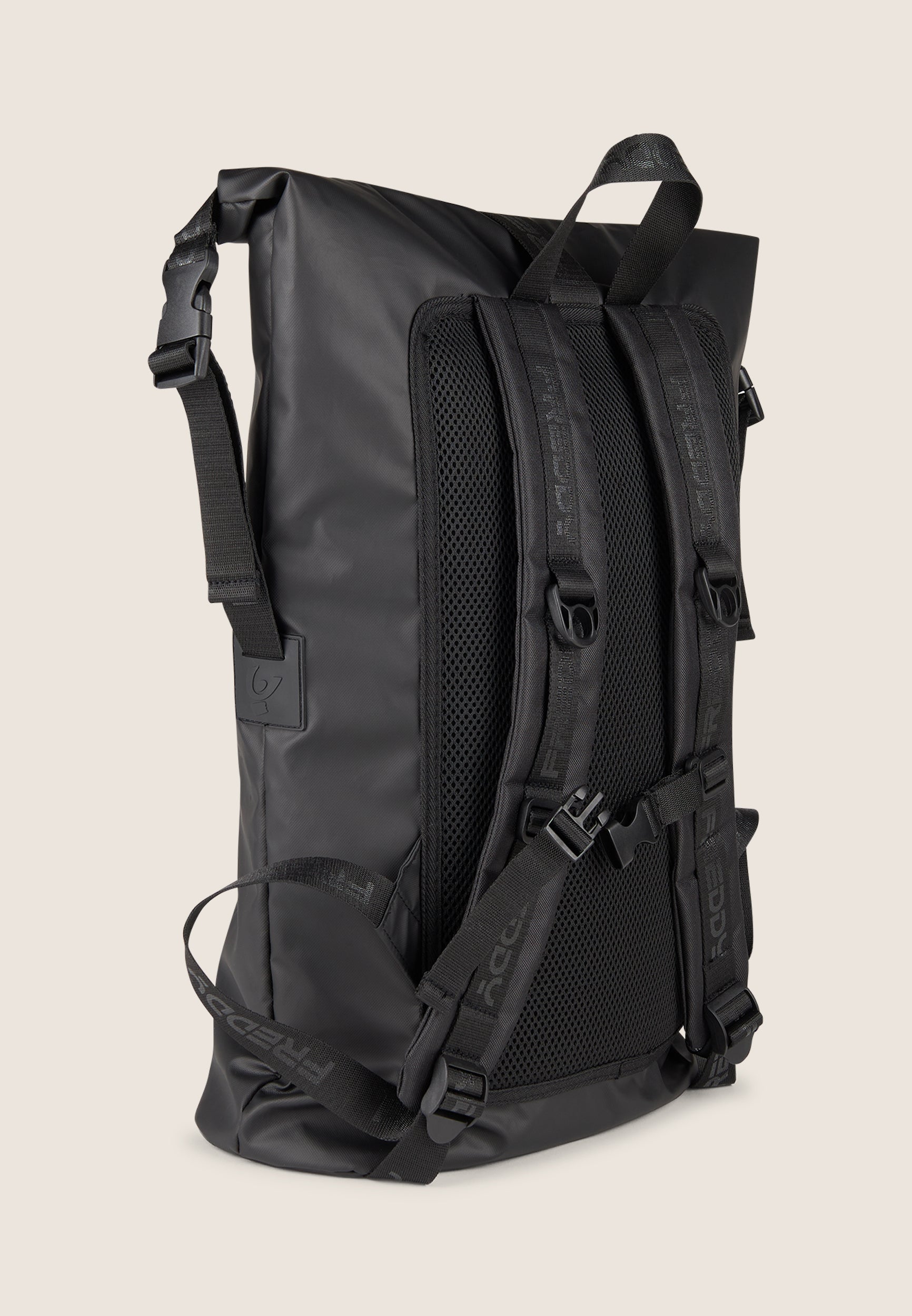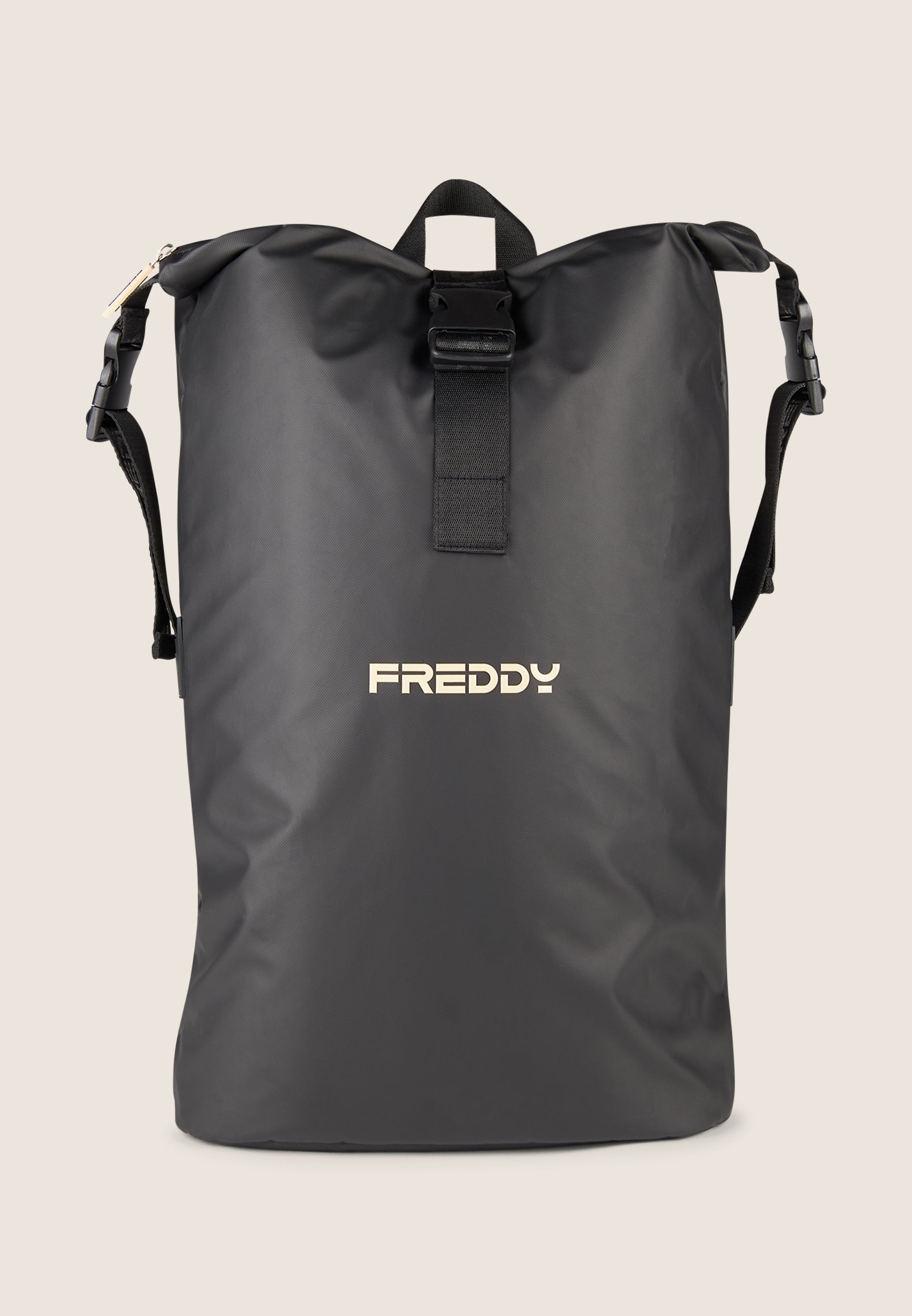 Perfect for sports and for leisure, this roll-top backpack in black recycled polyester combines style and functionality. The design with roll-up closure and central buckle provides protection from water, while the padded and adjustable shoulder straps with hooks offer maximum comfort. The FREDDY logo on the outside adds a distinctive touch. The padded back panel provides maximum support, while the inside zip pocket enables you to organise all your essentials.