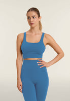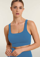 Medium support sports bra with removable moulded cups, ideal for daily training. The cut is designed to offer support and style: round neckline, regular shoulder straps crossed at the back, and side inserts in herringbone textured fabric. The nylon jersey fabric is breathable and durable.