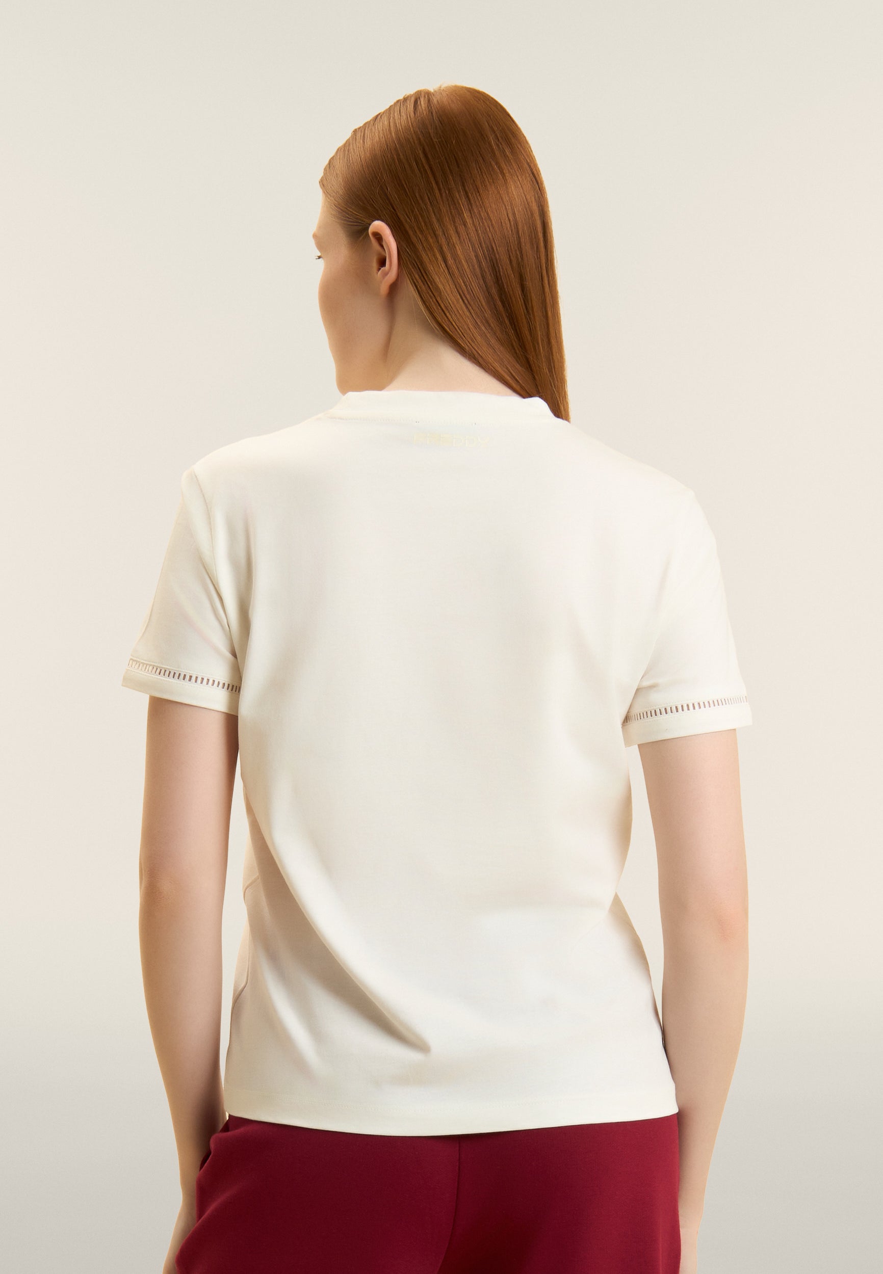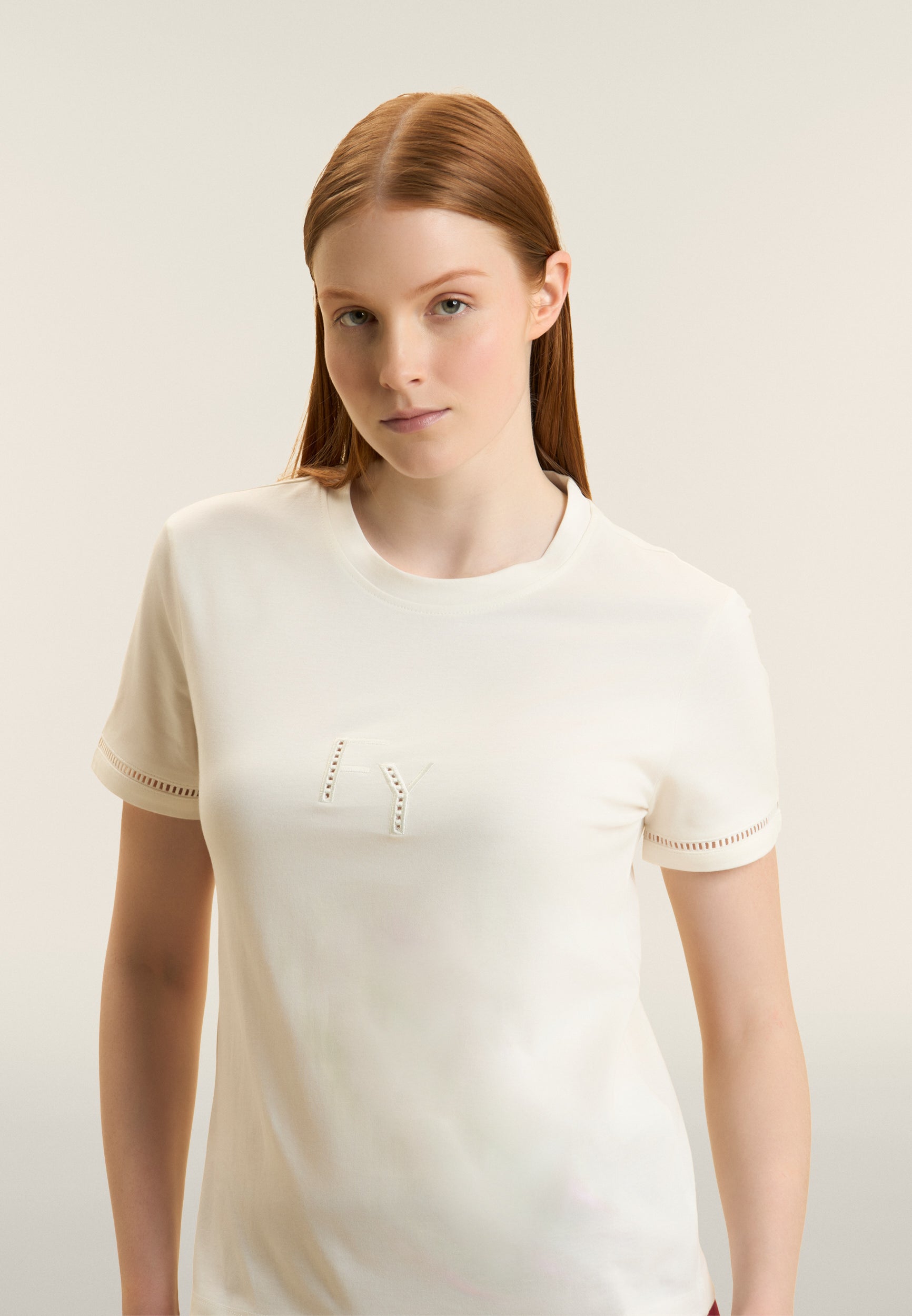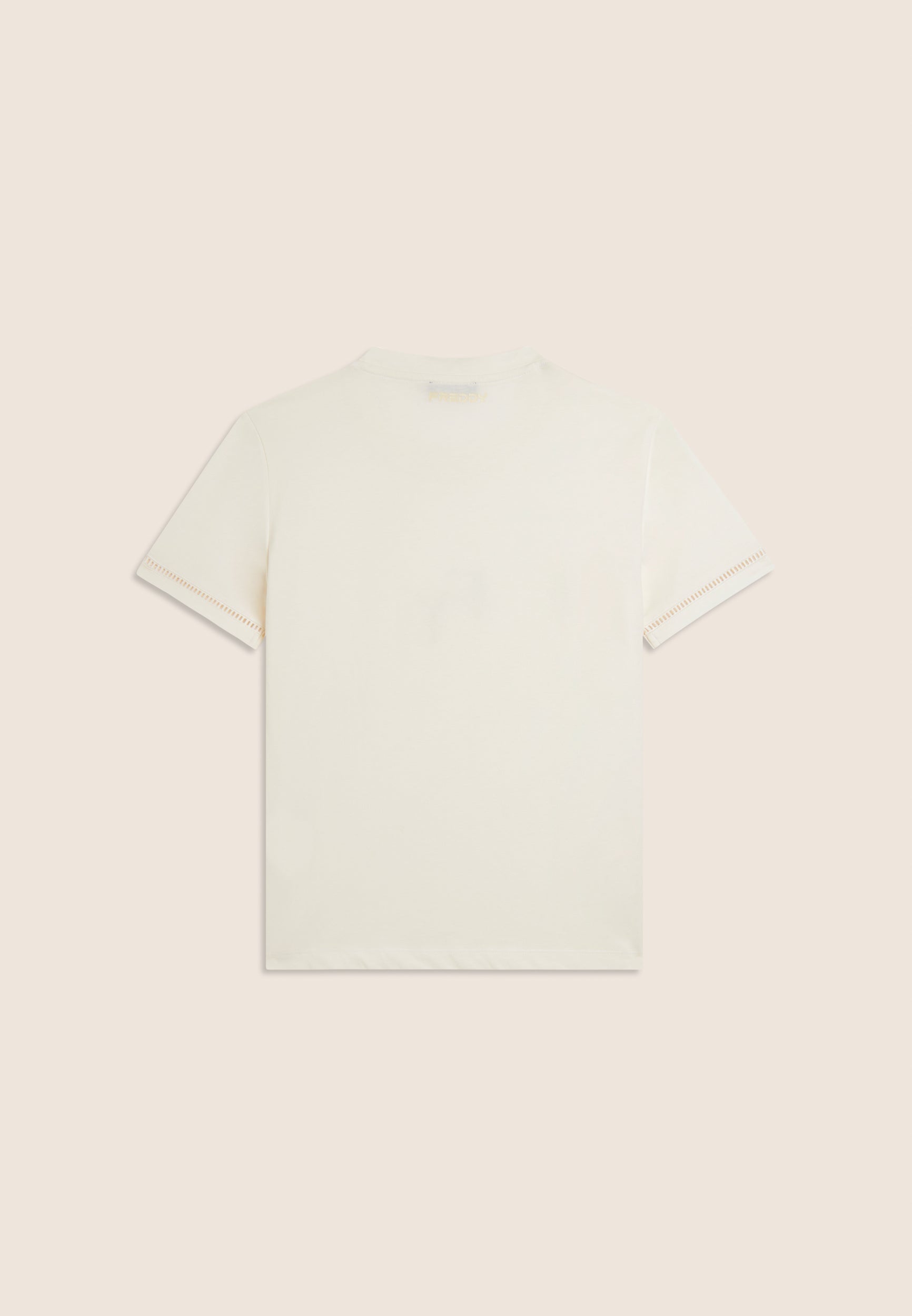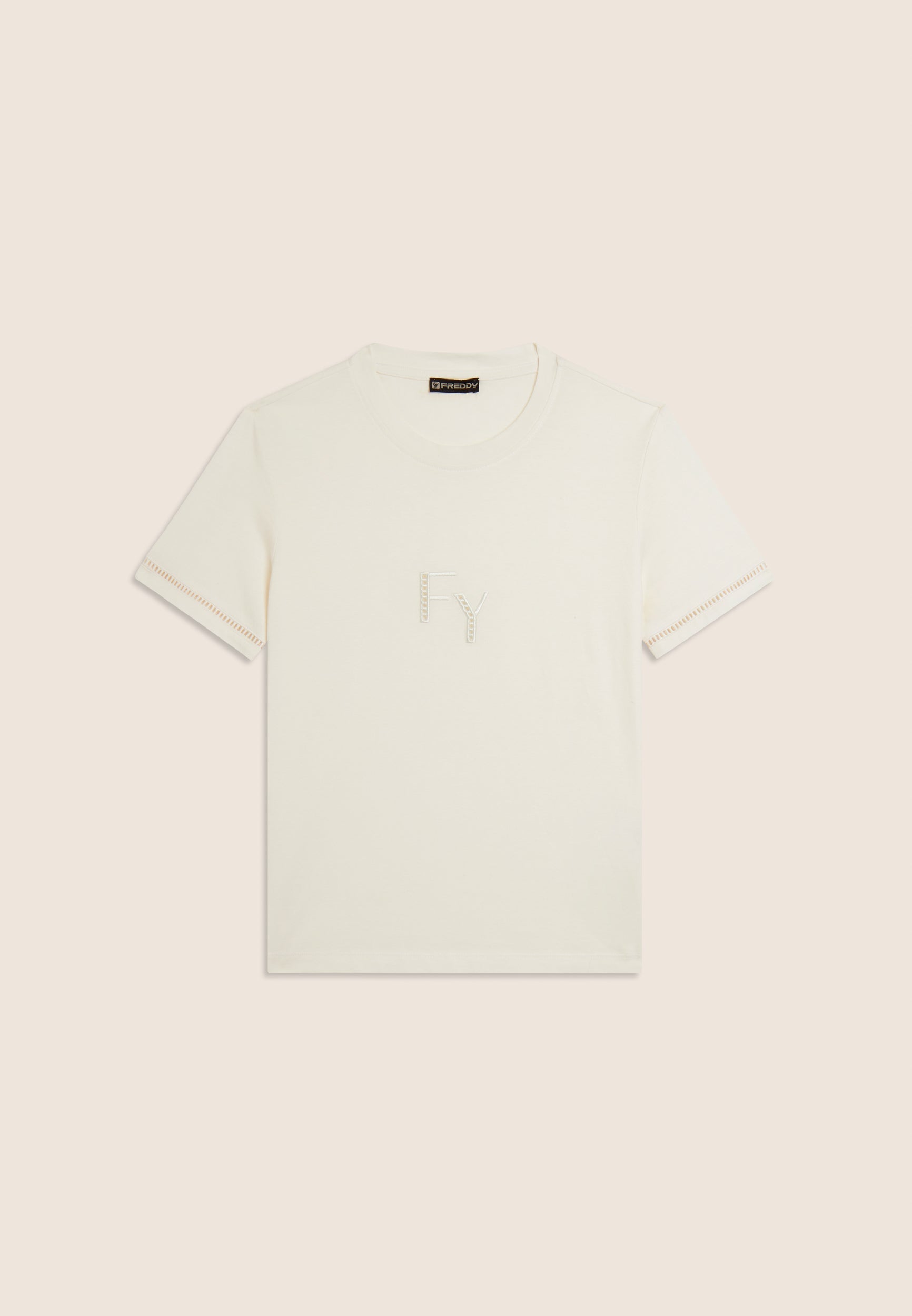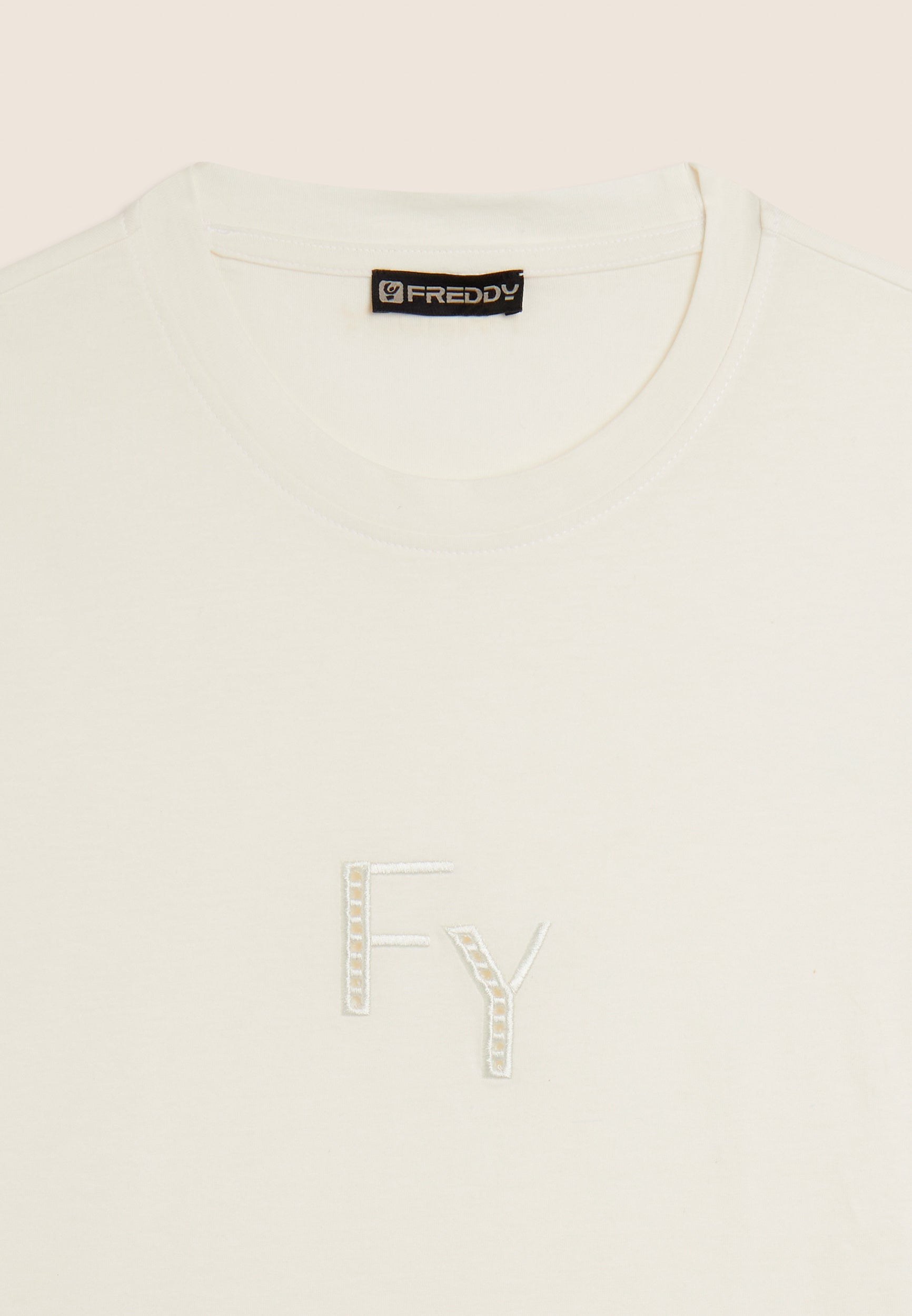 Regular-fit, standard-length t-shirt with straight hem. The minimalist design of crew neckline and short sleeves is enriched by the FY logo embroidered in a perforated form on the front, and the sleeve bottoms feature a decorative detail. A small Freddy logo is printed under the back neckline. Made of 100% cotton jersey, it guarantees comfort and breathability.